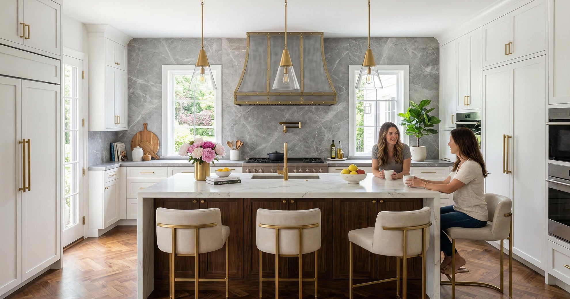 Black and gold Stainless Steel range hood, white cabinets with brass hardware, white subway backsplash tiles, natural wood floor in front of stove.
